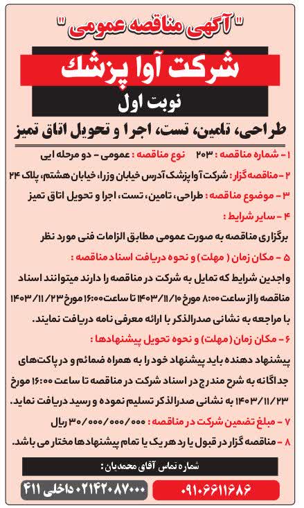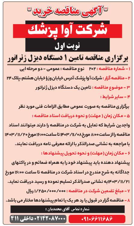 | آگهی مناقصه خرید یک دستگاه دیزل ژنراتور | آواپزشک | 1403/11/08 | دریافت سند | دریافت آگهی |