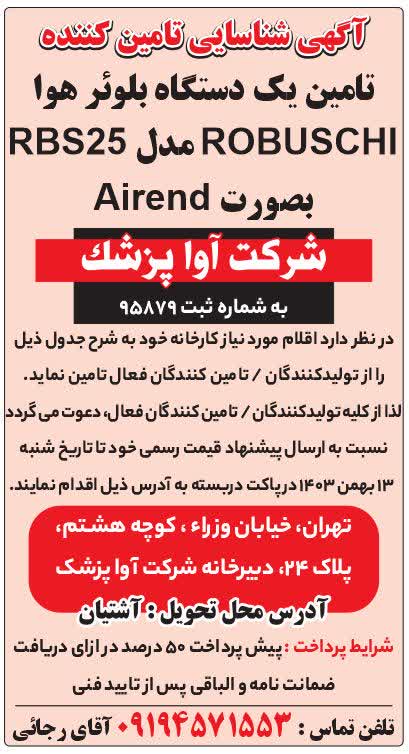 | آکهی شناسایی تامینکننده تامین یک دستگاه بلوئر هوا | آواپزشک | دریافت آگهی | ||